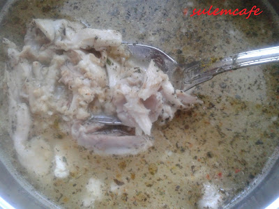 Kaynar tavuk suyuna 4 kasik yulaf ezmesi attim, tavugun etlerinden epeyce icine diderek ekledim.